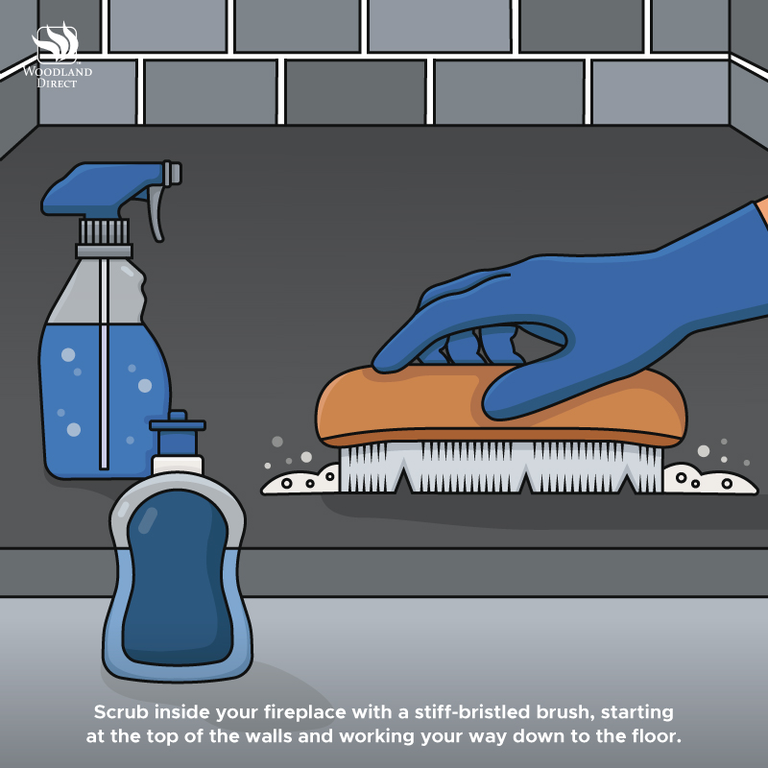 Scrub inside your fireplace with a stiff-bristled brush, starting at the top of the walls and working your way down to the floor.
