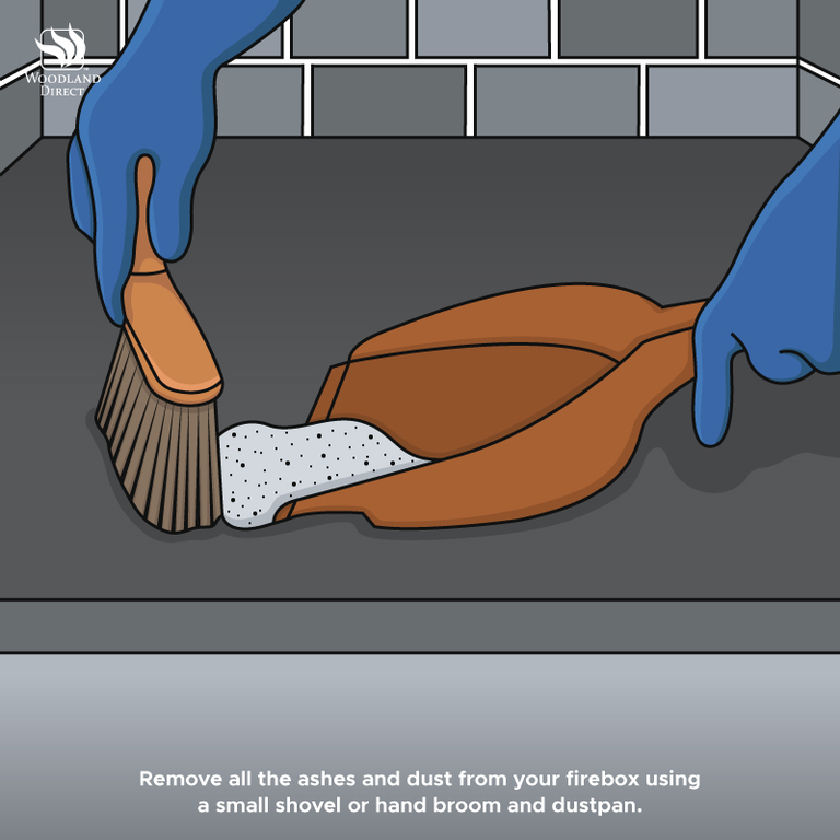 Wait at least 24 hours after using your wood burning fireplace to begin cleaning it. When it’s completely cool and safe to handle, remove all the ashes and dust from your firebox using a small shovel or hand broom and a dustpan.