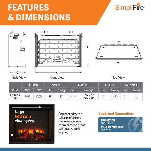 The Simplifire Built-In Electric Fireplace - 30” has been created with a traditional, authentic style. A textured log set sits inside a detailed masonry-style interior. Equipped with the ability to change between four flame heights, a multifunction r...